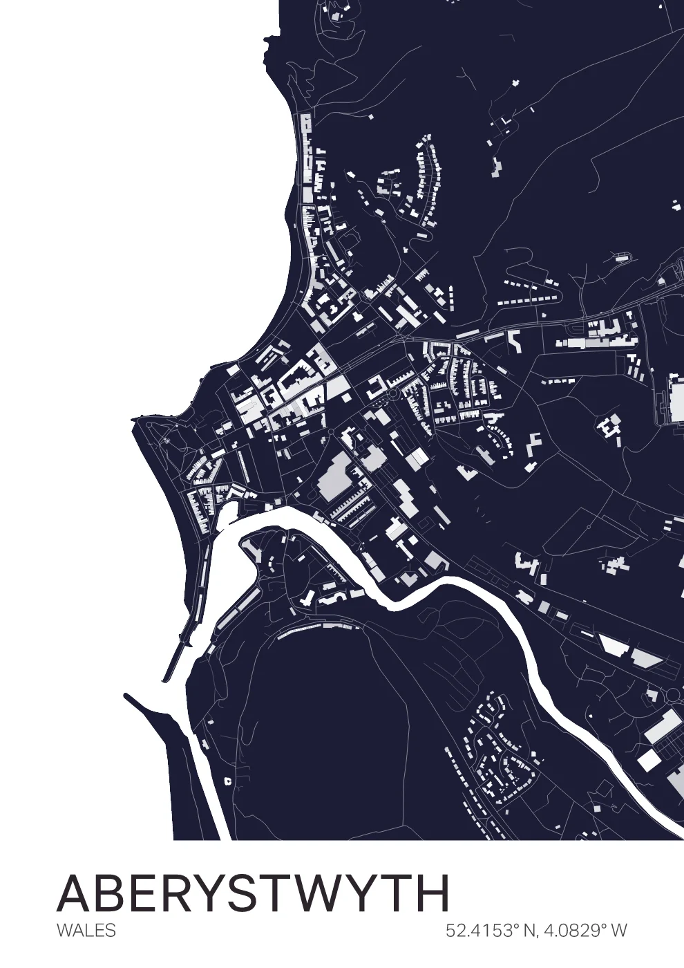 A detailed map of Aberystwyth, capturing the coastal layout and distinctive structure of this vibrant Welsh town, including the sweeping curve of Cardigan Bay. Designed with a focus on clarity and balance, this print brings a subtle, modern feel to any space. A perfect gift for students, locals, or anyone who loves the Welsh coast.