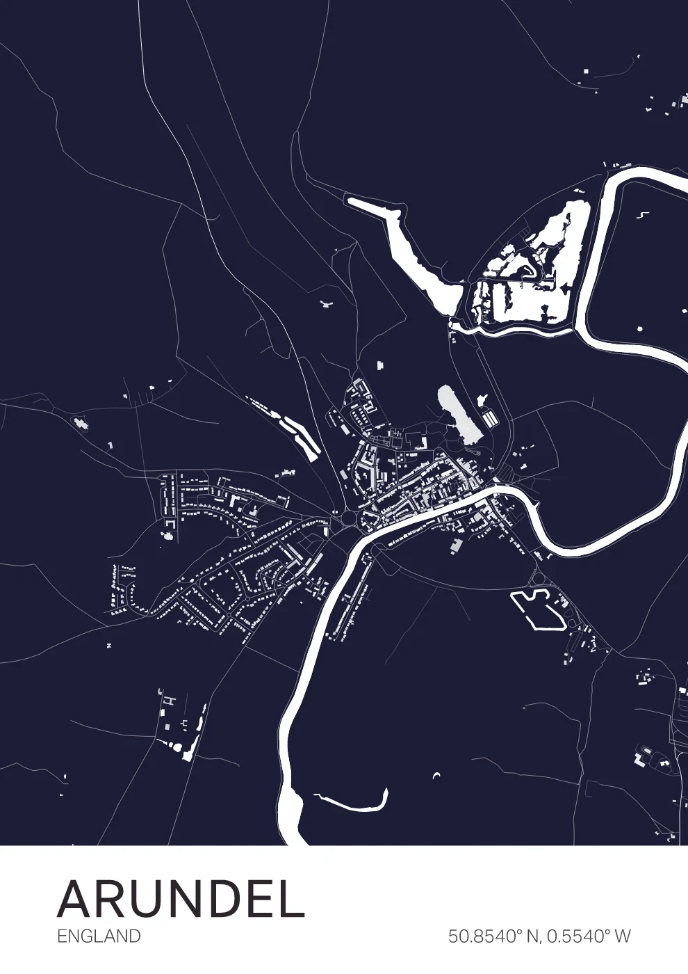 A detailed map of Arundel, highlighting the structure of this historic Sussex town, centred around the River Arun and overlooked by Arundel Castle. Designed with a focus on clarity and balance, this piece brings a refined, understated feel to any space. Ideal as a gift or for those with a connection to this distinctive part of West Sussex.