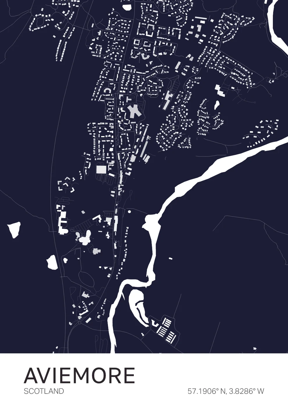 A refined map of Aviemore, reflecting the layout of this Highland town set within the Cairngorms National Park. The design balances clarity and detail, creating a calm, modern piece suited to a range of interiors. A great choice for those who enjoy the outdoors or have spent time in the Scottish Highlands.
