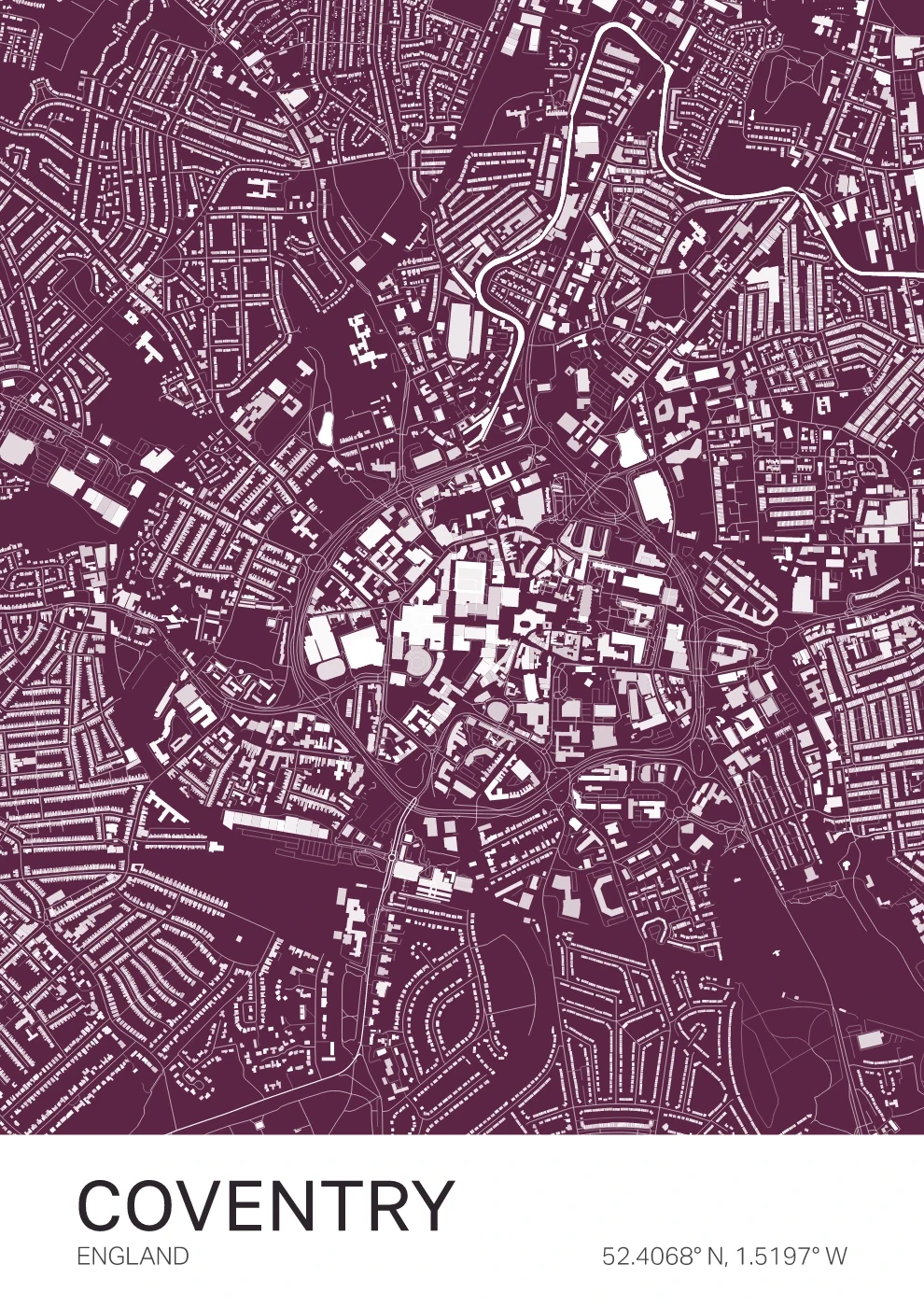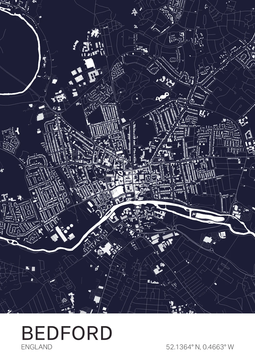 A detailed map of Bedford, centred around the River Great Ouse and the town's surrounding layout. Designed with a focus on balance and clarity, it offers a subtle, modern aesthetic. A great option for those connected to Bedford or looking for a clean, understated map print.