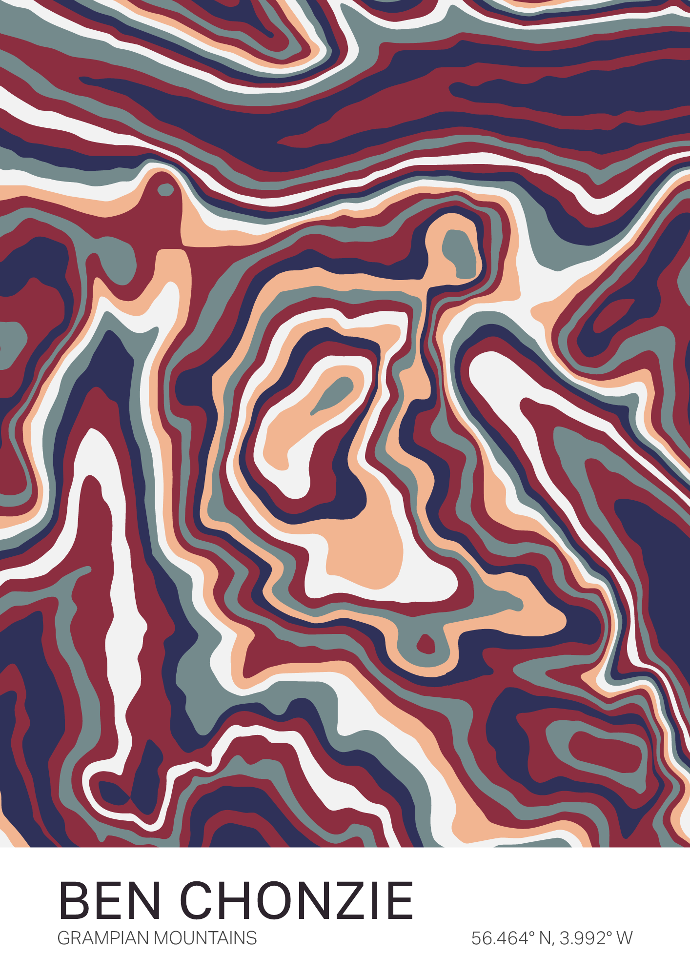 A vibrant, colorful map of Ben Chonzie — a peaceful Perthshire Munro offering vast open moorland, soft contours, and far-reaching Highland views.