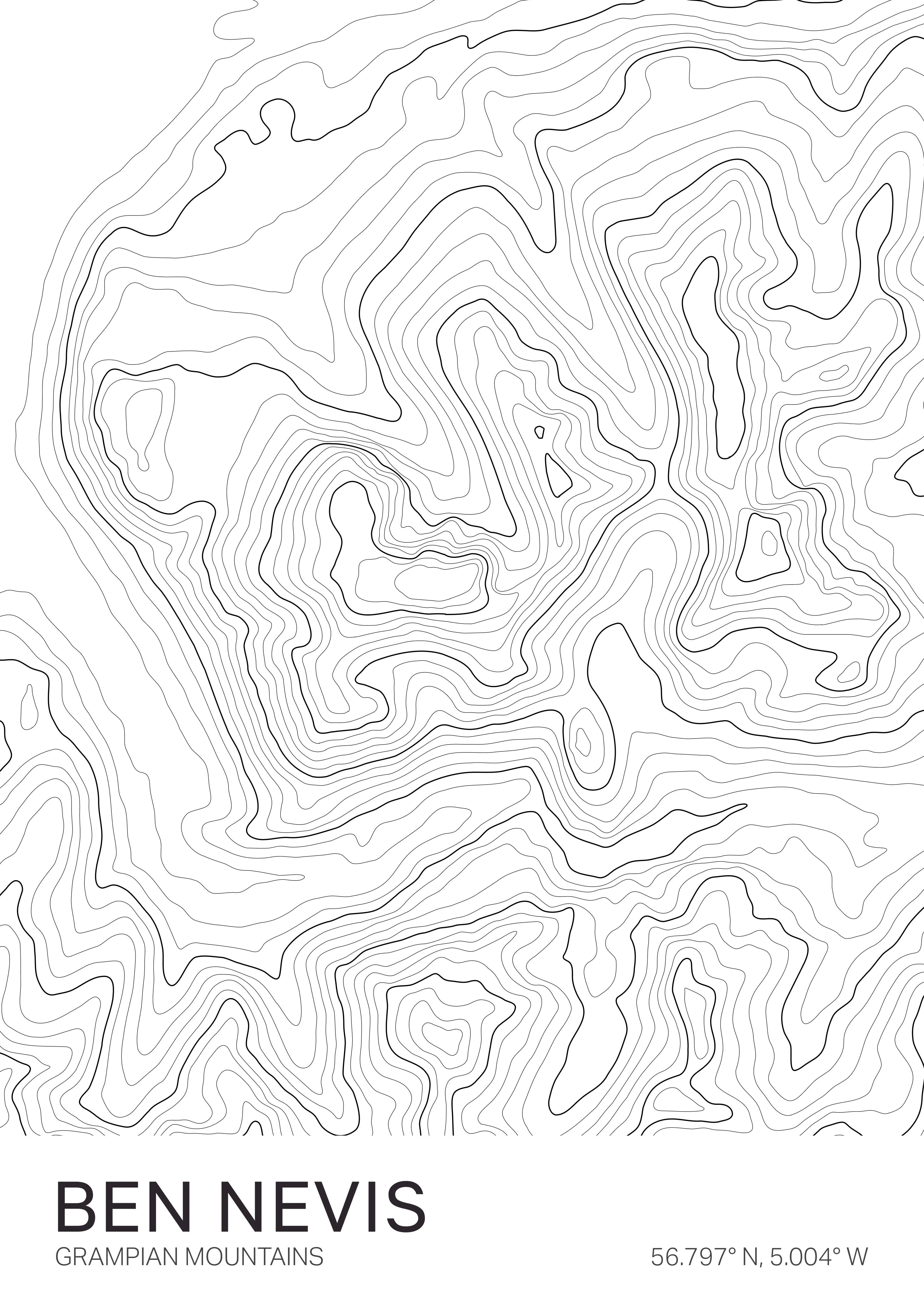 This Ben Nevis black contour line print adds a strong monochrome statement to modern and minimalist interiors. Ideal for climbers, hikers, and Scottish mountain lovers.