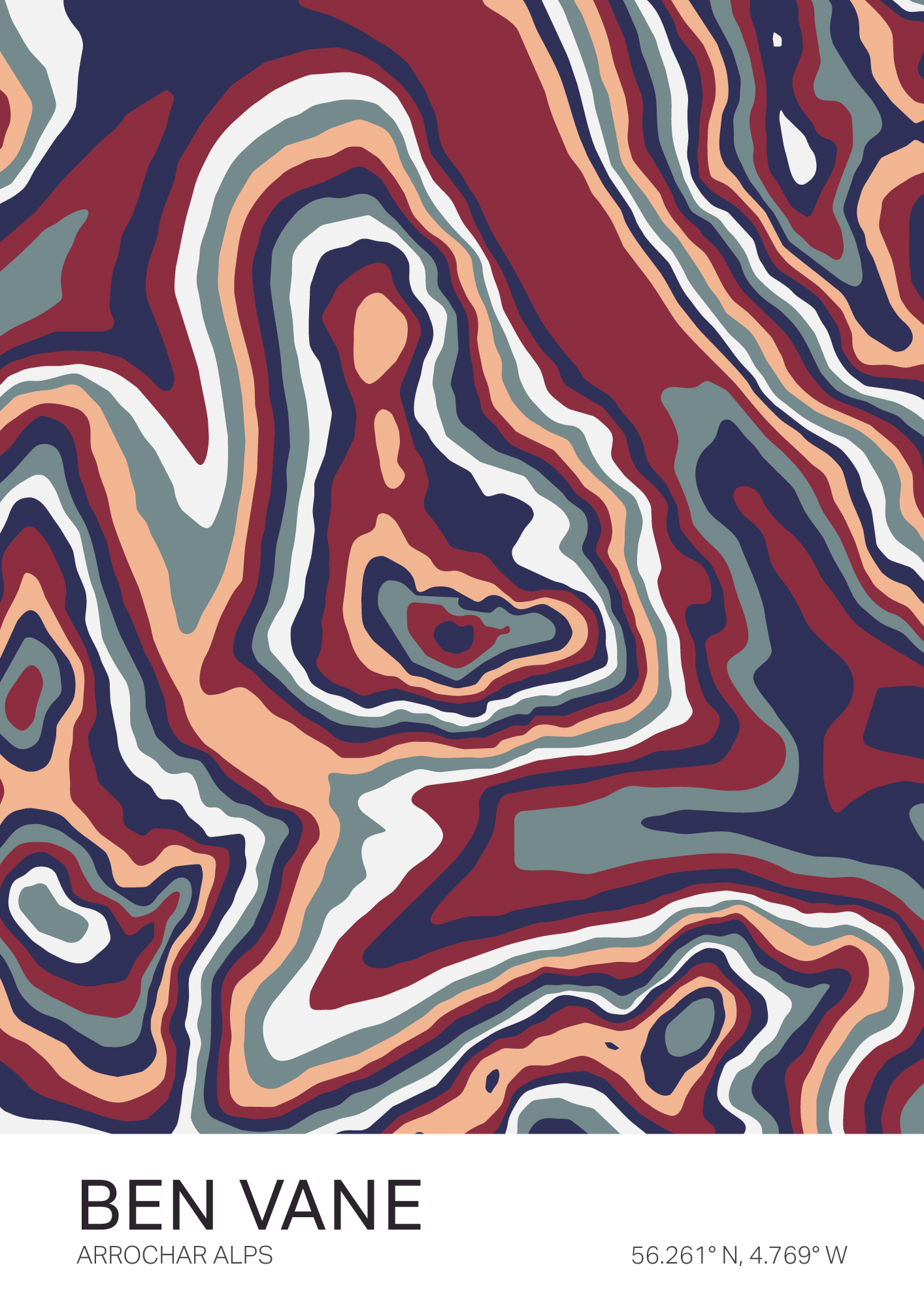 A vibrant, colorful map of Ben Vane — one of the Arrochar Alps near Loch Lomond, a compact yet rugged Munro known for its steep slopes and panoramic summit views.