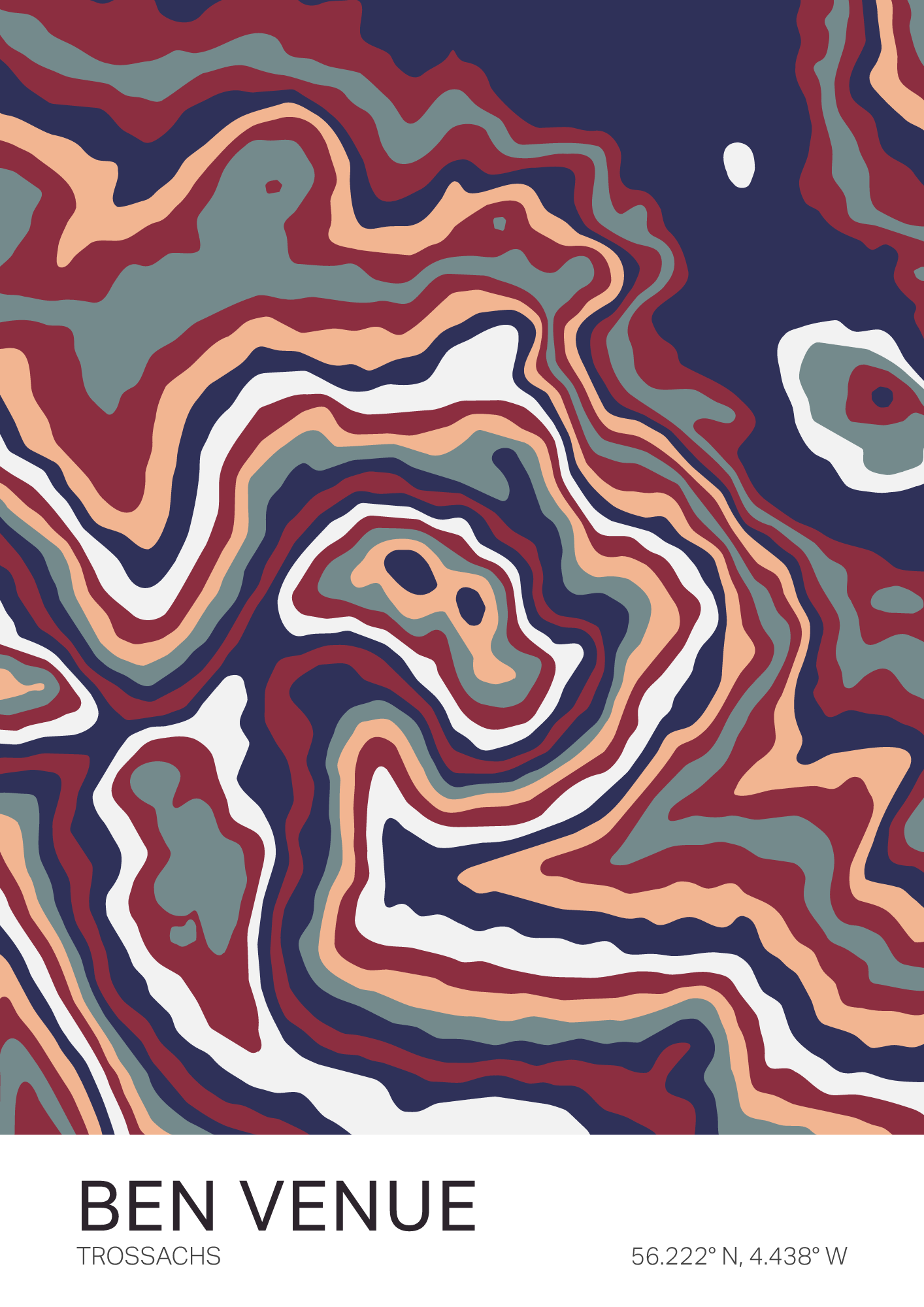 A vibrant, colorful map of Ben Venue — the heart of the Trossachs, surrounded by lochs and forests, offering one of Scotland’s most scenic viewpoints.