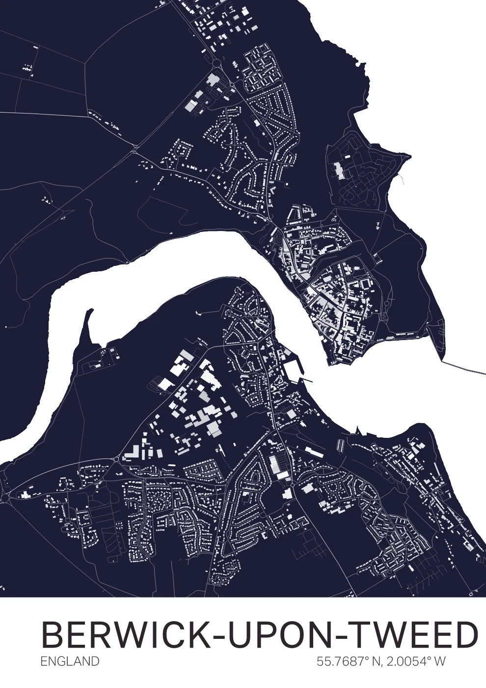A refined map of Berwick-upon-Tweed, capturing the layout of this historic border town, shaped by the River Tweed and its iconic Elizabethan walls. A clean and thoughtful design that reflects the town's unique position between England and Scotland. Ideal for those connected to the Northumberland coast.