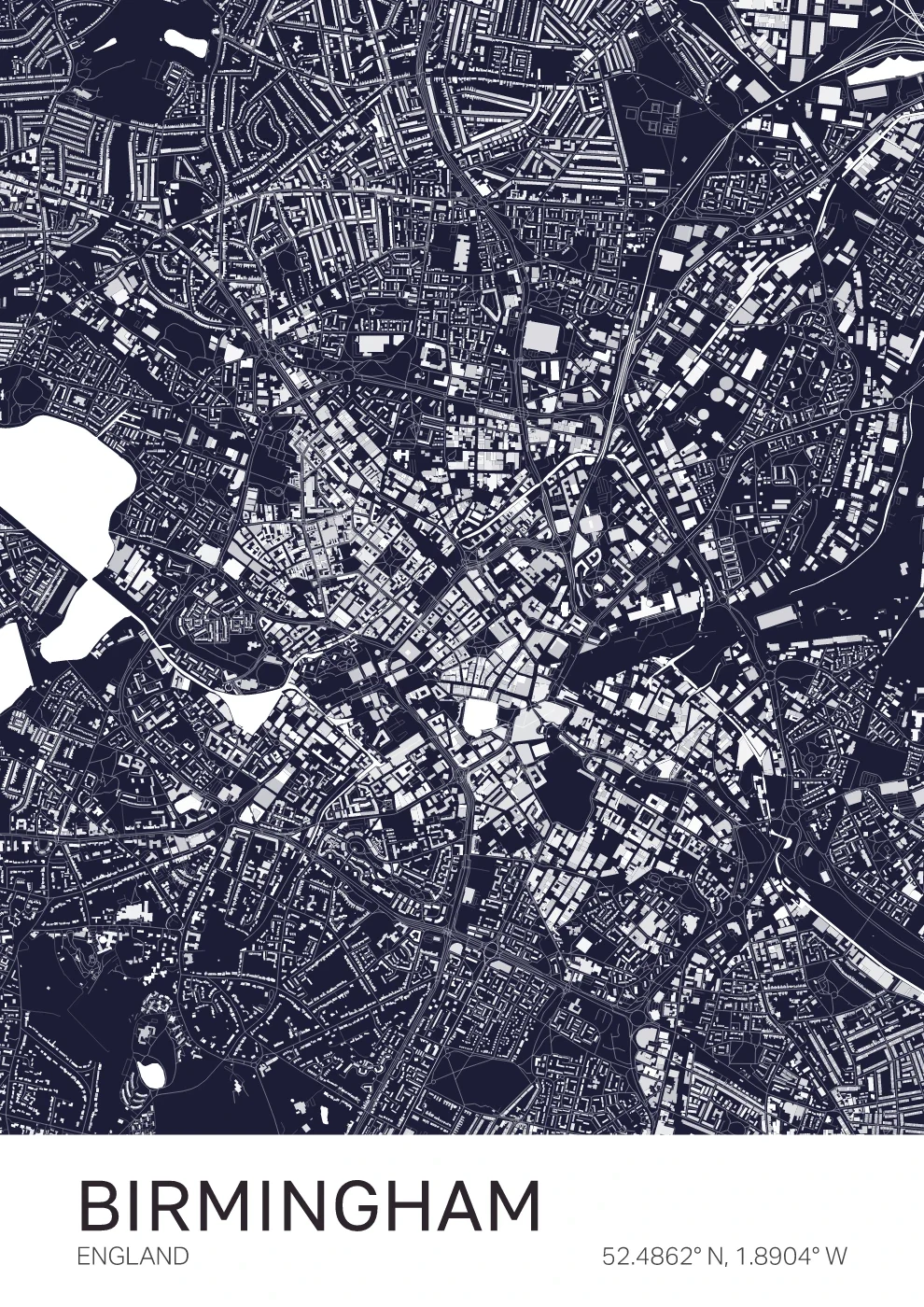 A detailed map of Birmingham, capturing the structure of the UK's second city, including its canal network and central districts. Designed with clarity and balance, it offers a clean, modern aesthetic. Ideal for those connected to Birmingham or its industrial heritage.