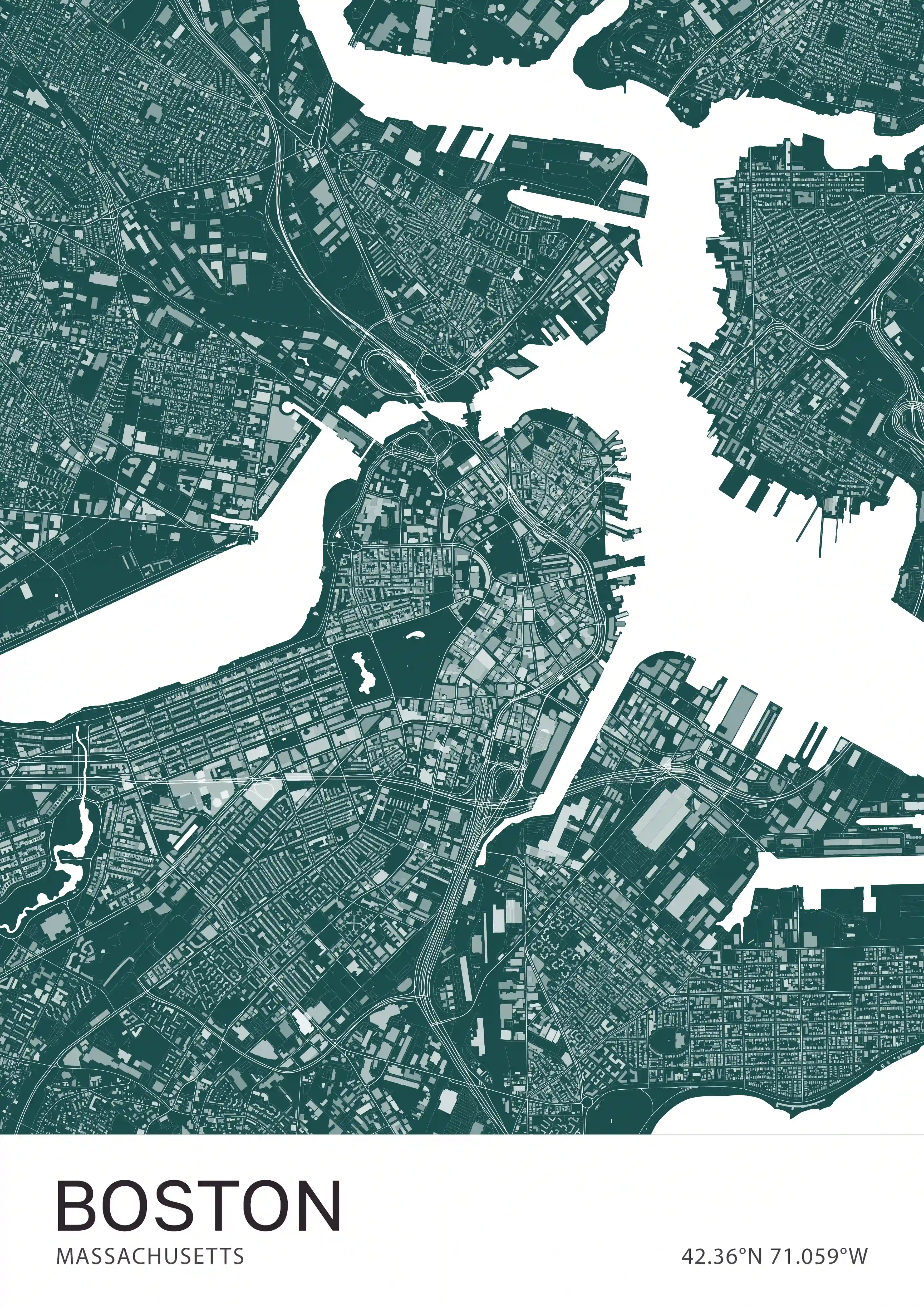 A detailed map of Boston, USA’s historic city blending colonial heritage with modern innovation and architectural splendor.