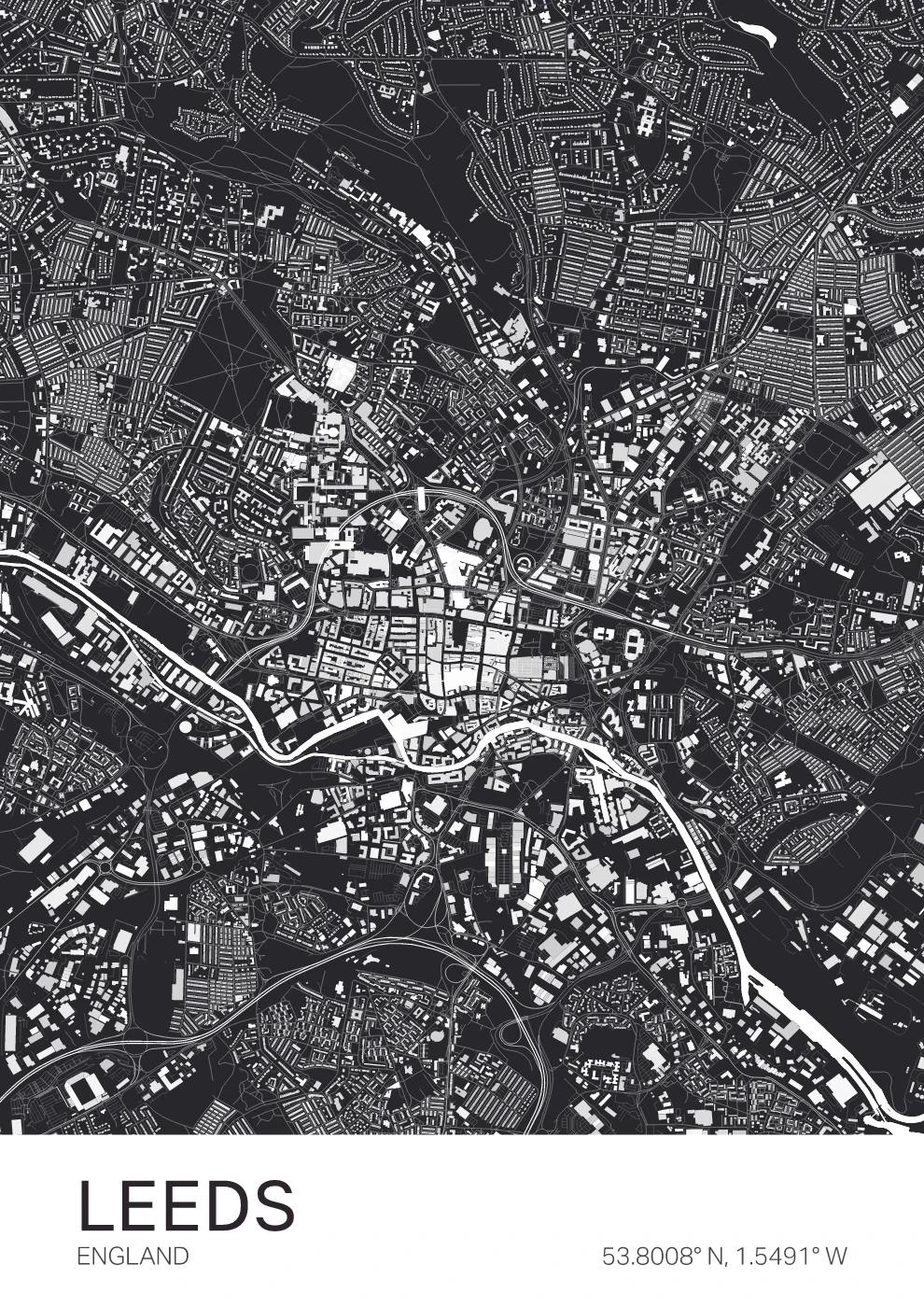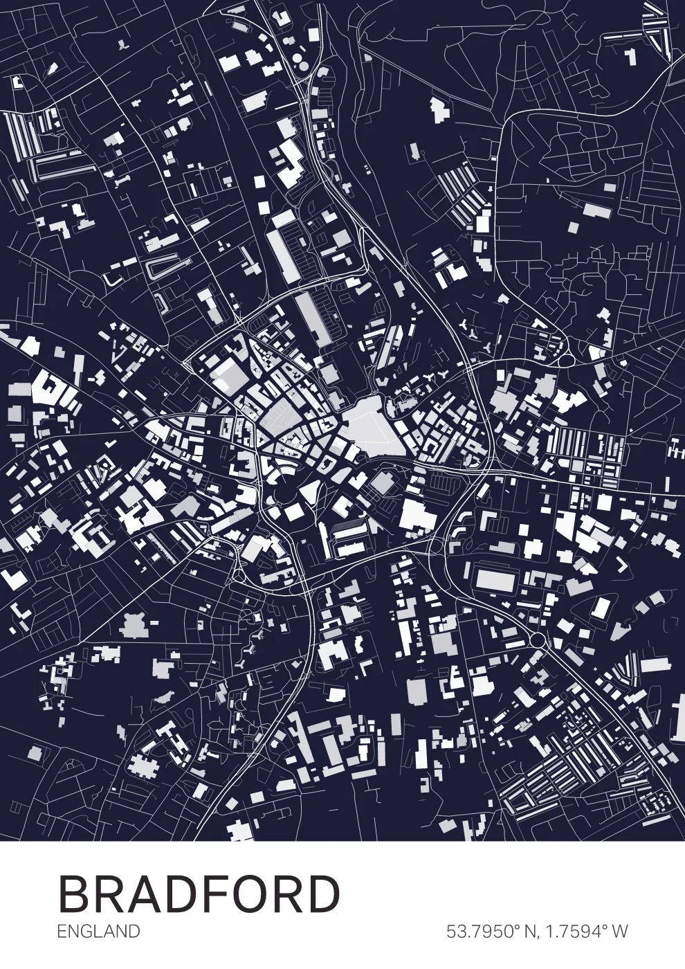 A structured map of Bradford, capturing the layout of this West Yorkshire city, shaped by its industrial heritage and surrounding hills. Designed with clarity and balance, this piece brings a clean, contemporary feel to any space. Ideal for those connected to Bradford or the wider Yorkshire region.