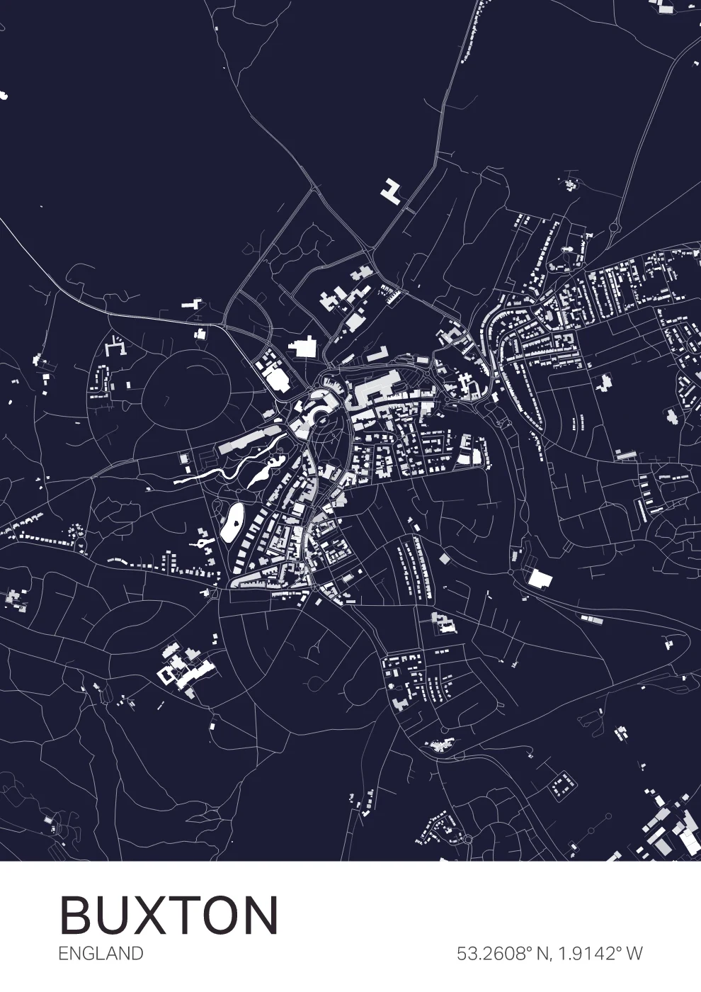 A structured map of Buxton, reflecting the layout of this Derbyshire spa town, known for landmarks such as the Crescent and Pavilion Gardens. A clean and balanced design suited to modern interiors. Perfect for those who know Buxton or the Peak District.