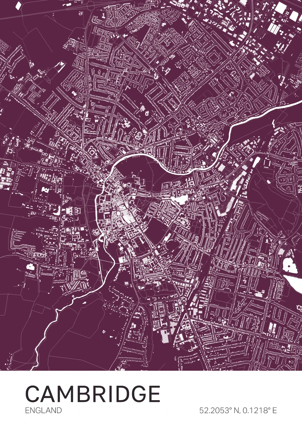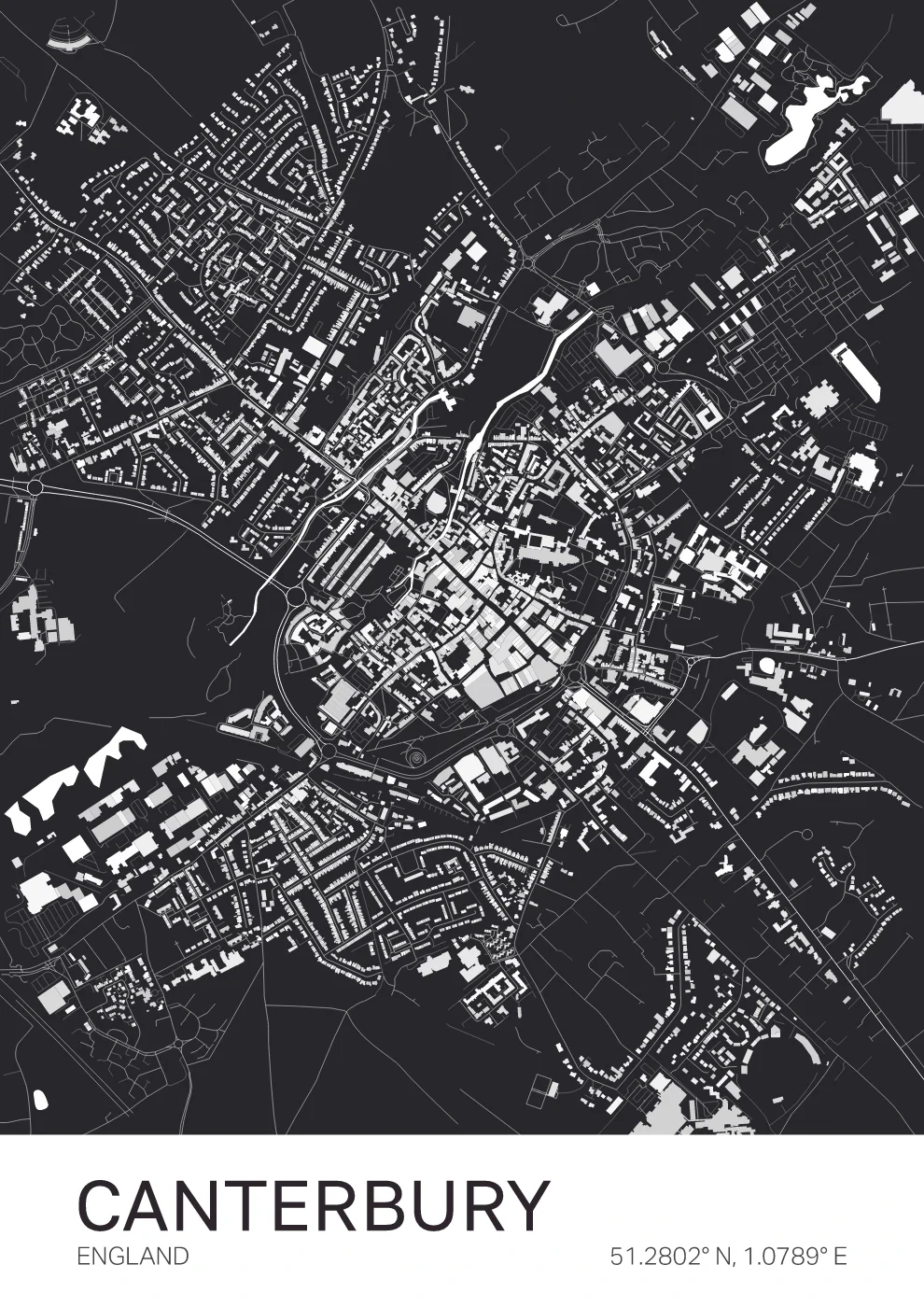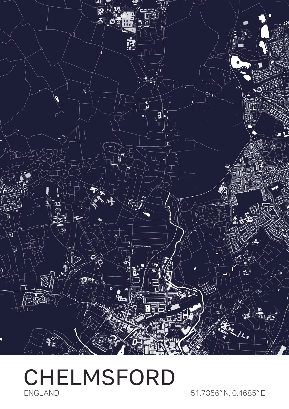 A structured map of Chelmsford, centred around the River Chelmer and the city's evolving urban layout. Designed with clarity and balance, this piece brings a clean, contemporary feel to any space. A strong choice for those connected to Essex or this growing city.