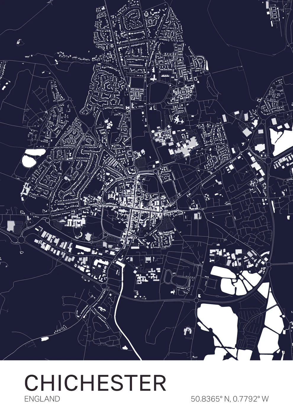A clean map of Chichester, reflecting the distinctive Roman grid layout that defines the city centre. Designed with clarity and precision, this piece offers a calm, architectural feel. Ideal for those connected to Chichester or the surrounding Sussex area.