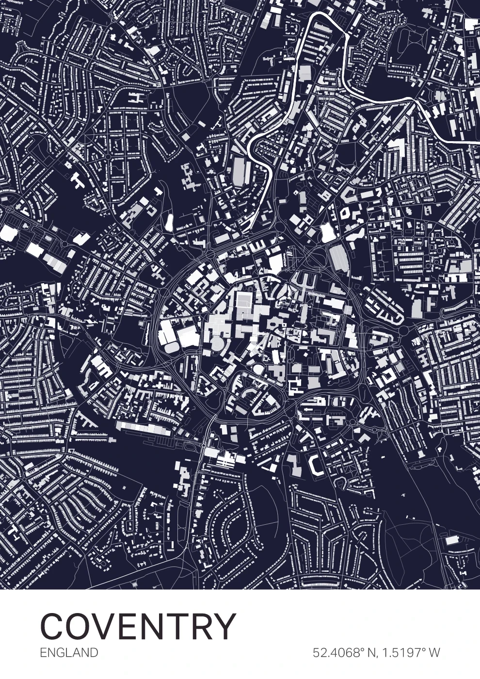 A refined map of Coventry, reflecting the layout of the city, from its historic centre to its modern redevelopment. A clean and balanced design that works effortlessly in contemporary interiors. A strong piece for those connected to Coventry.