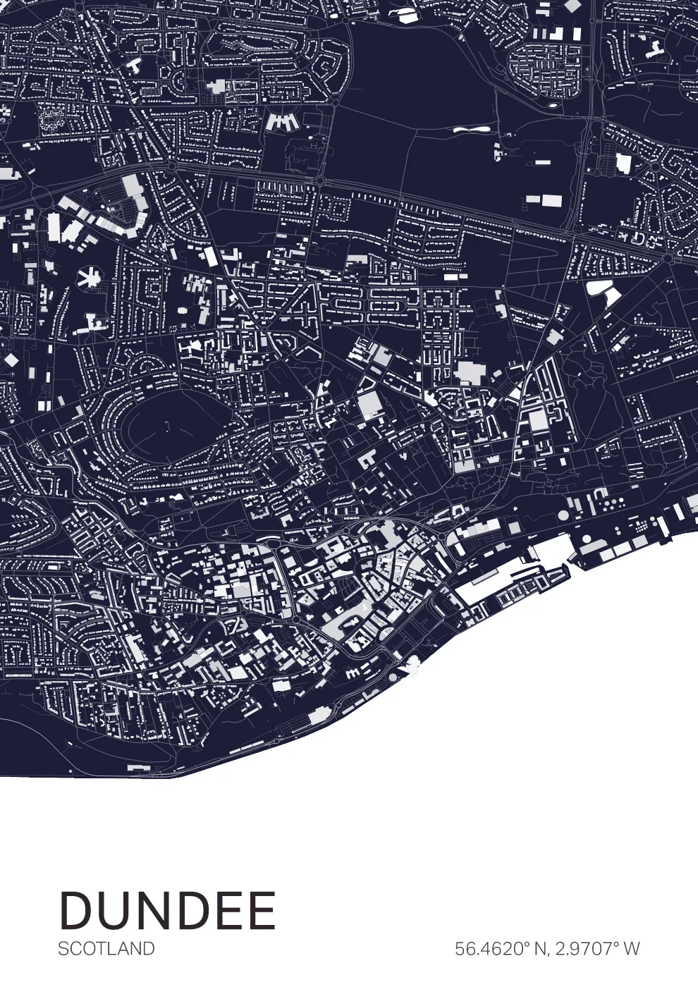 A refined map of Dundee, shaped by its position along the River Tay and its evolving waterfront. A clean and modern design that reflects both structure and openness. Ideal for those connected to Dundee or Scotland's east coast.