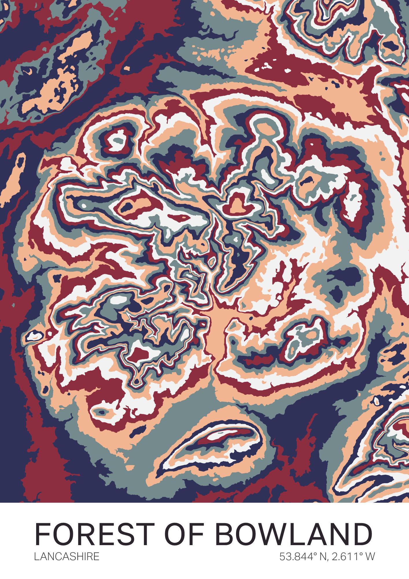 A vibrant, colorful map of the Forest of Bowland — an Area of Outstanding Natural Beauty in Lancashire, where sweeping heather moors meet hidden valleys and ancient woodland.