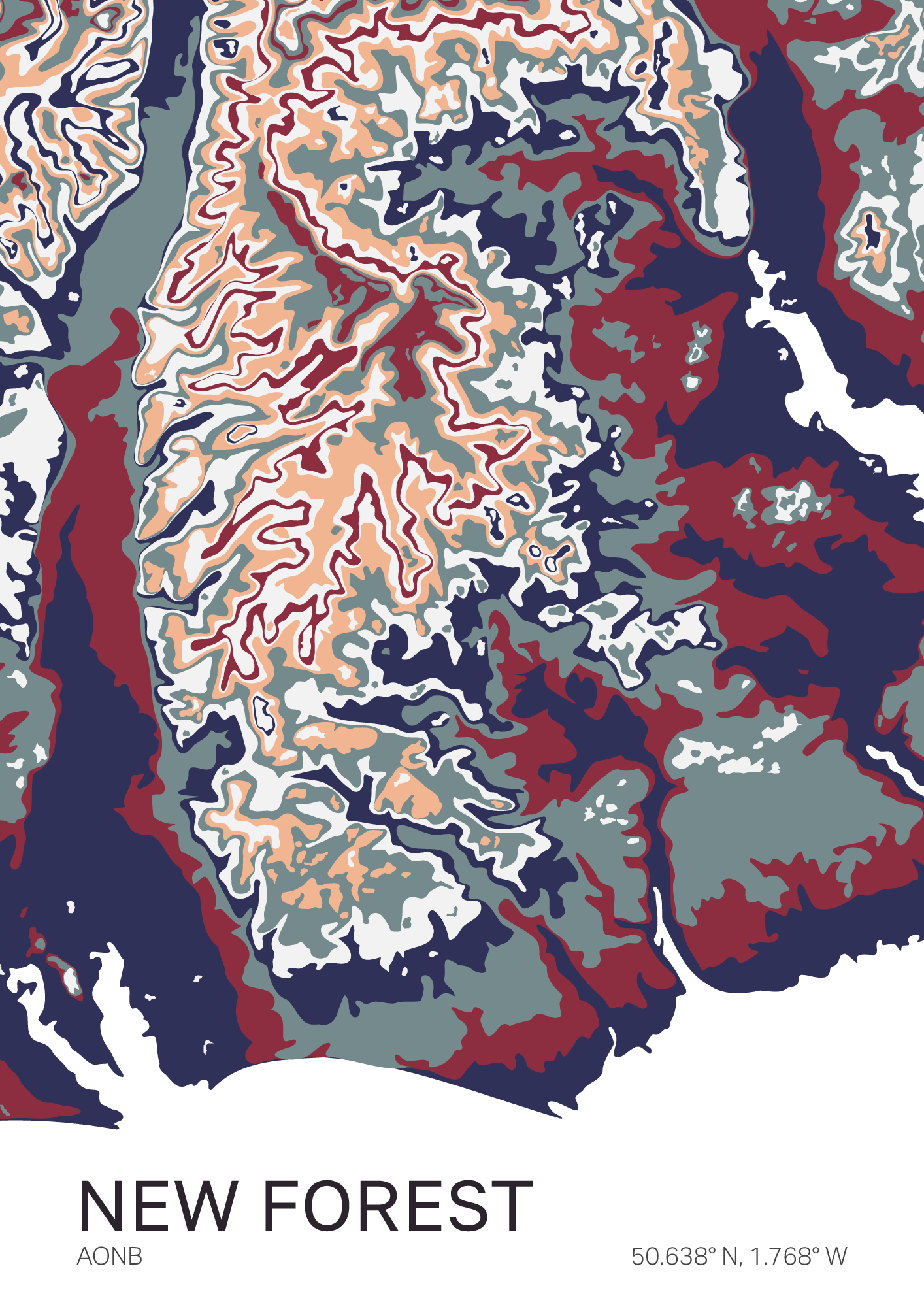 A vibrant, colorful map of the New Forest — a patchwork of ancient woodland, heath, and wild ponies on England’s southern coast, where nature and history intertwine.