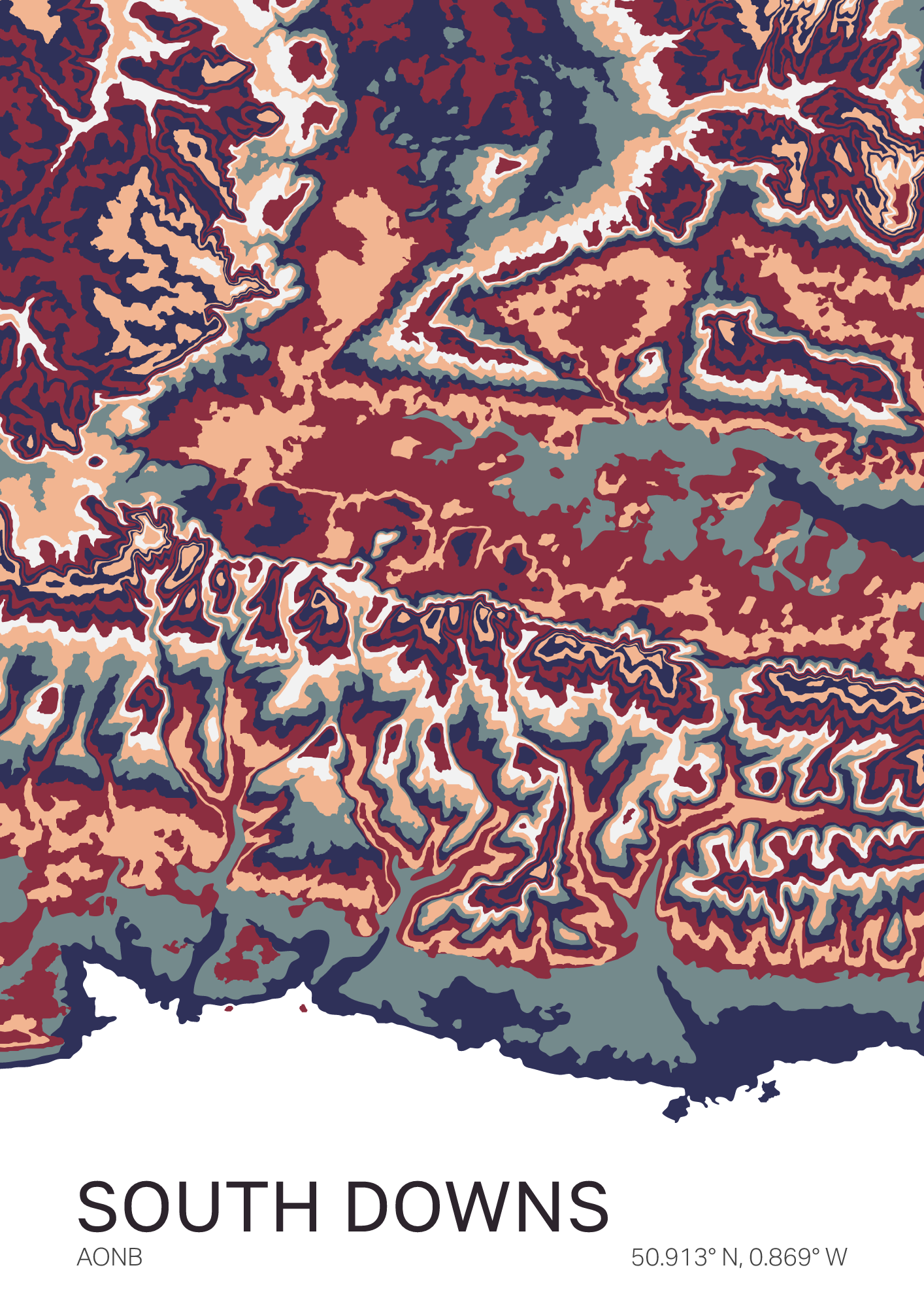 A vibrant, colorful map of the South Downs — England’s rolling chalk ridge running from Winchester to Eastbourne, where soft hills meet the sea and villages nestle in green valleys.