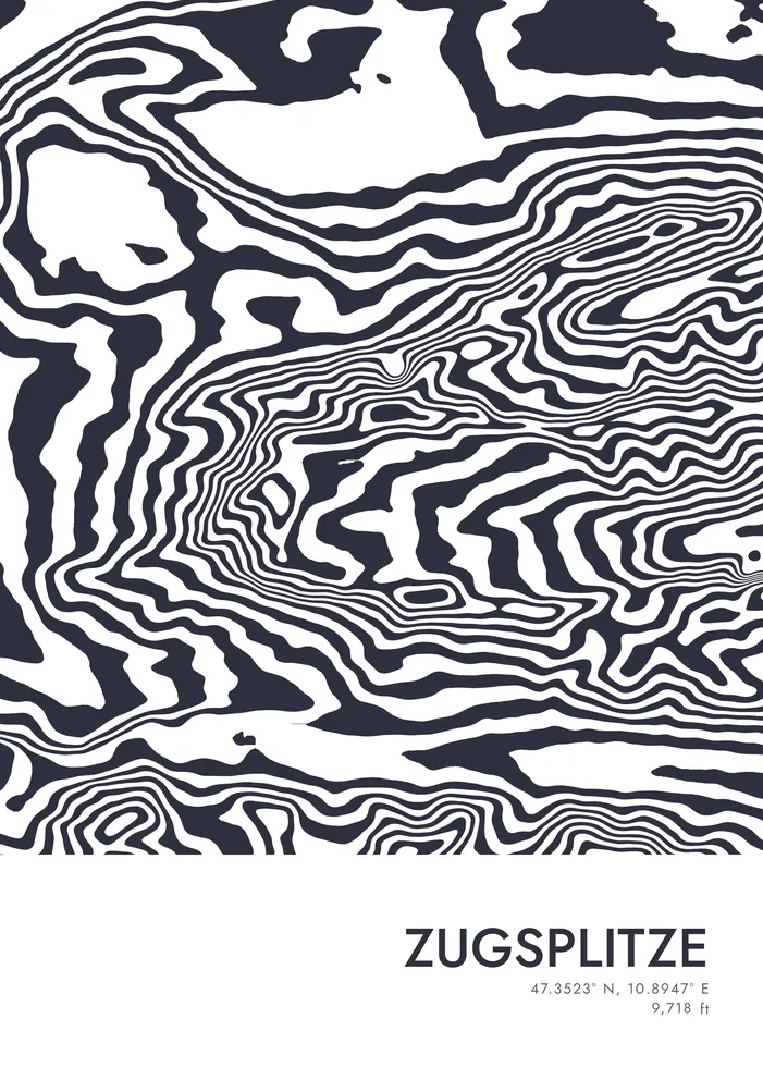 A classic two-color contour map of Zugspitze, the highest mountain in Germany, located in the Bavarian Alps.