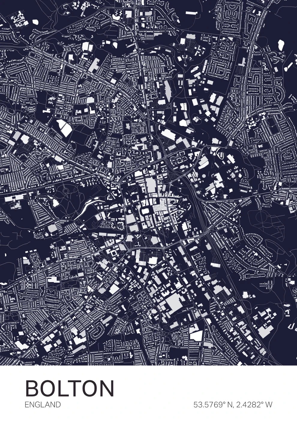 A detailed map of Bolton, reflecting the layout of this Greater Manchester town and its surrounding areas. Designed with clarity and simplicity, it fits seamlessly into modern interiors. A meaningful piece for those connected to Bolton or the North West.