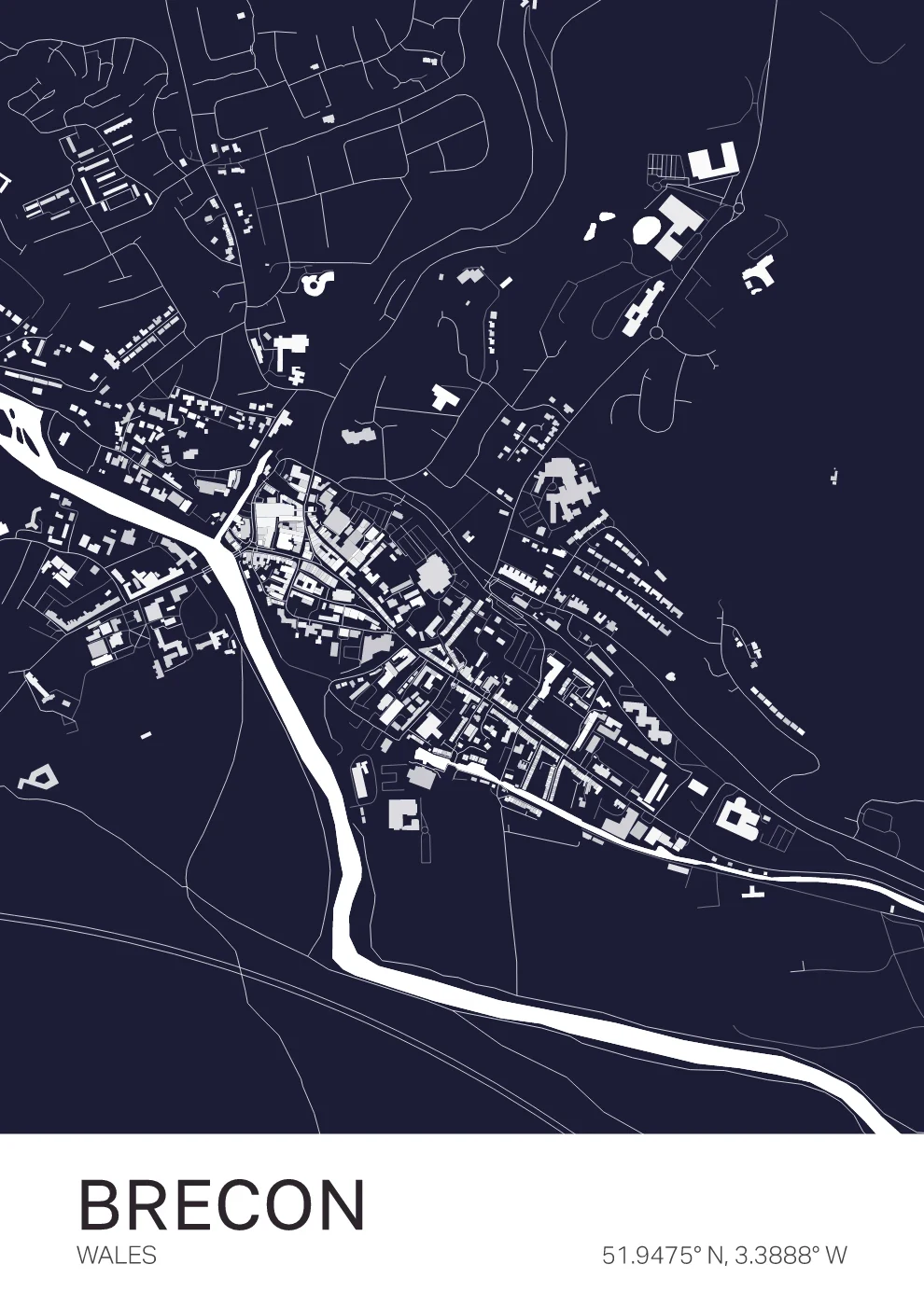 A detailed map of Brecon, centred around the River Usk and the gateway to the Brecon Beacons National Park. The design captures both structure and setting, creating a calm, natural feel. Ideal for those who know the area or enjoy the landscapes of South Wales.