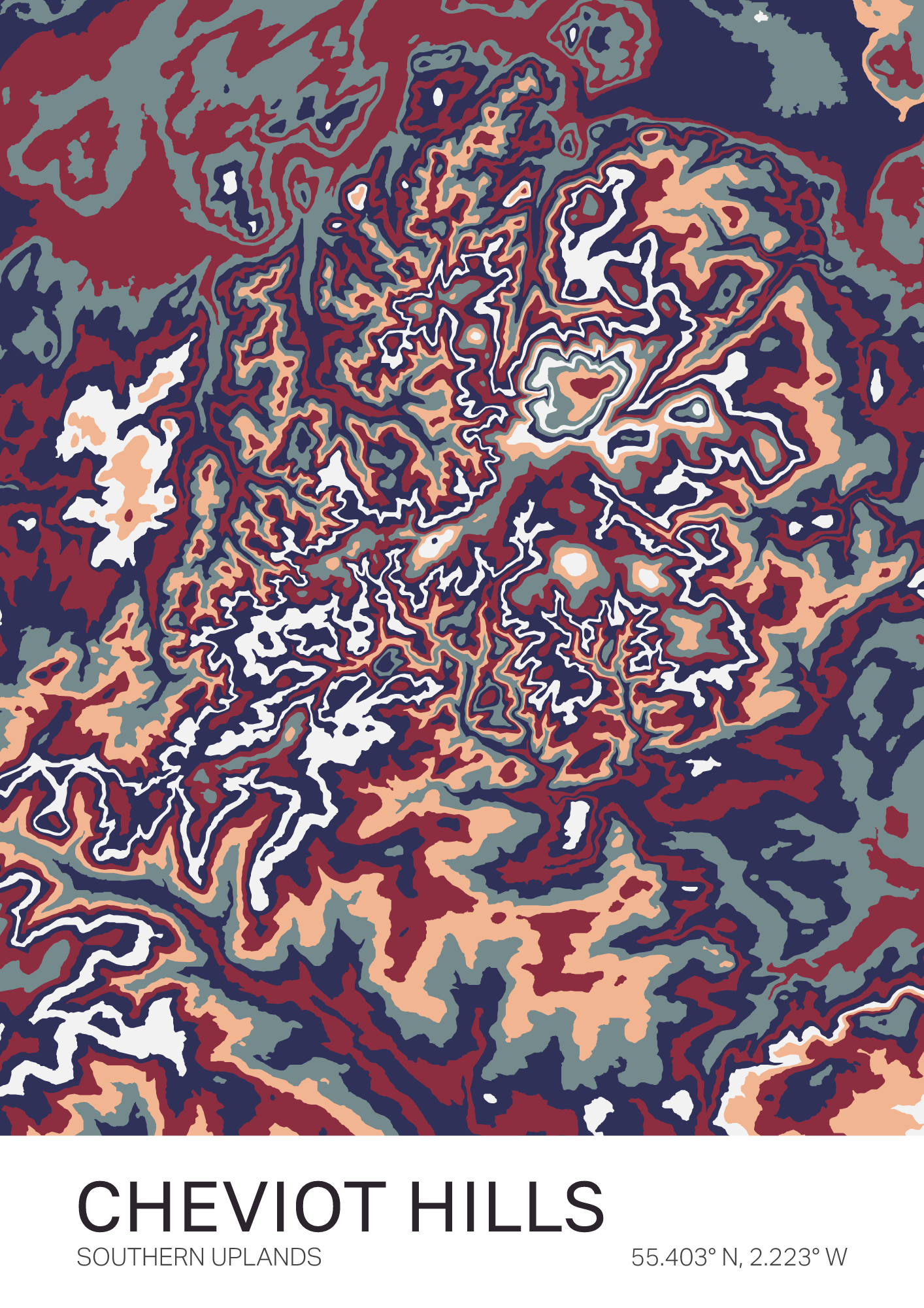 A vibrant, colorful map of the Cheviot Hills — the wild northern uplands straddling the English–Scottish border, renowned for sweeping moorlands and dramatic ridge lines.