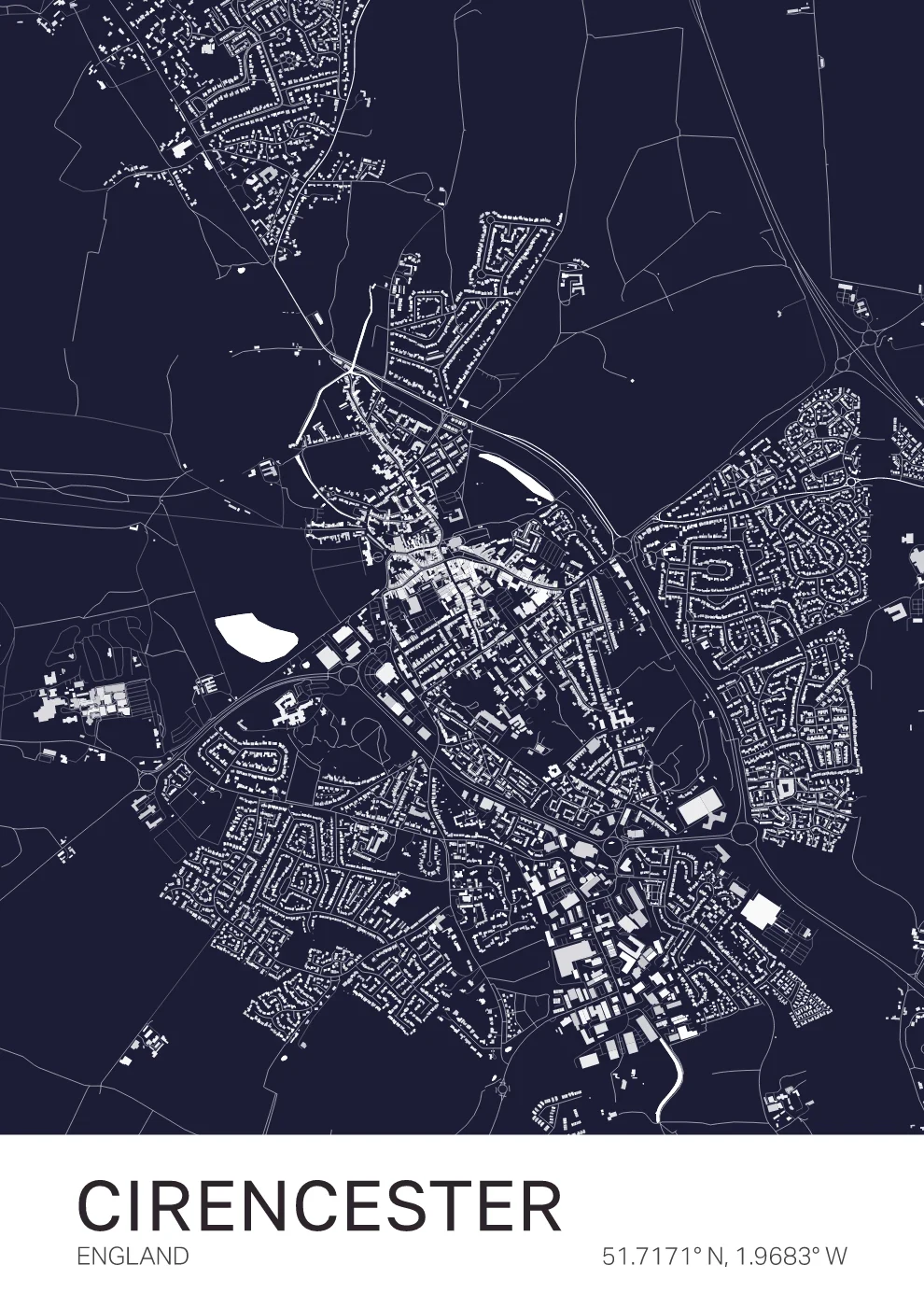 A refined map of Cirencester, capturing the layout of this historic Cotswold town, once a major Roman settlement. A balanced and understated design that suits both modern and traditional interiors. A great option for those connected to the Cotswolds.