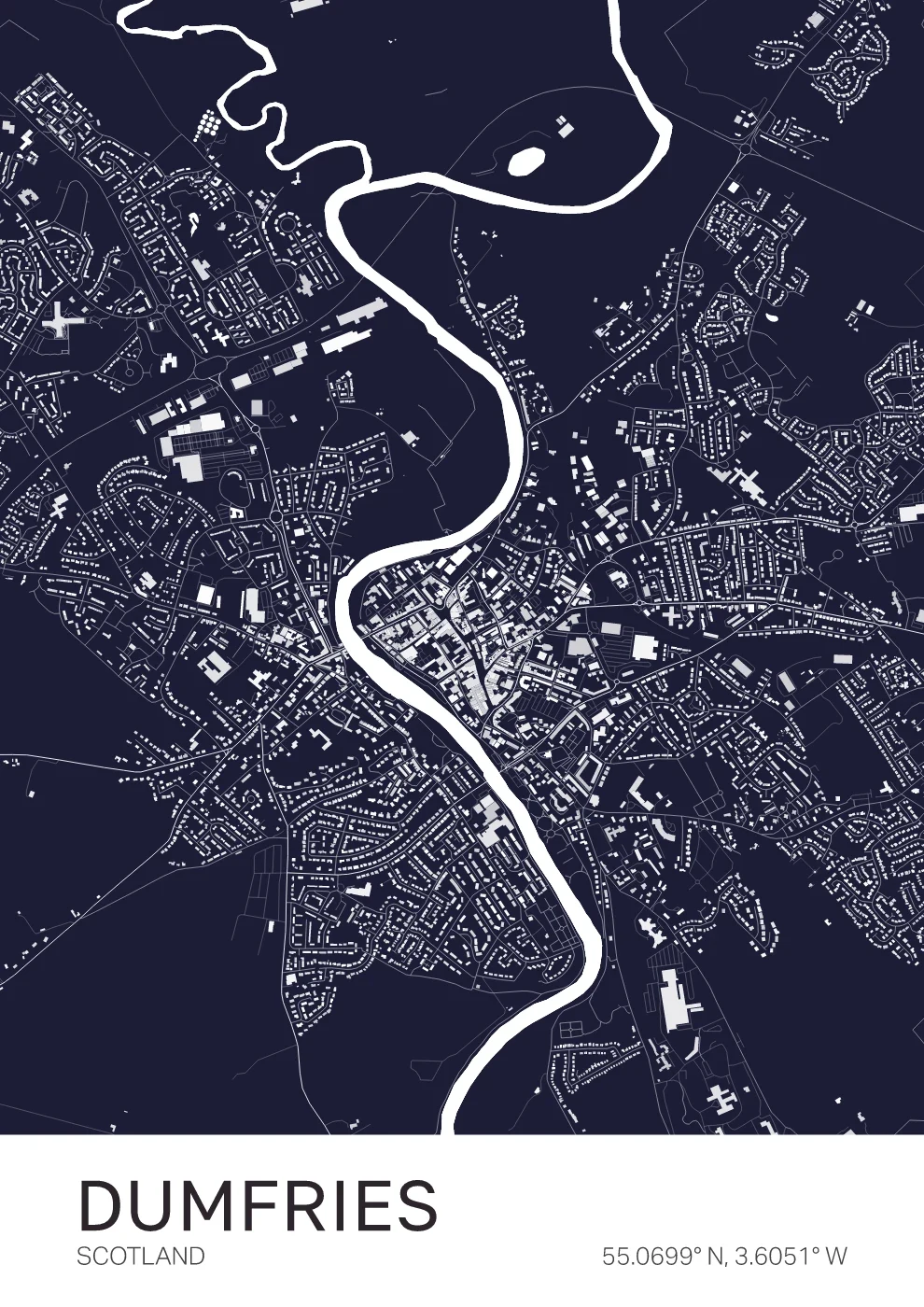 A structured map of Dumfries, centred around the River Nith as it flows through this historic Scottish town. Designed with clarity and restraint, it creates a calm and balanced composition. A fitting piece for those connected to southwest Scotland.