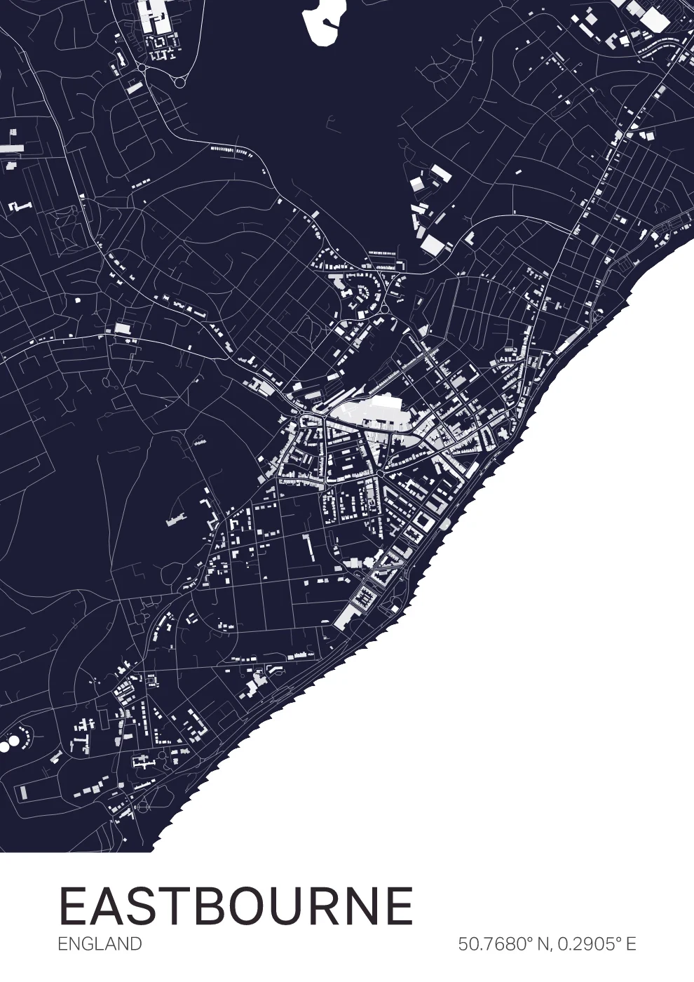 A detailed map of Eastbourne, shaped by its coastal position and proximity to the South Downs and Beachy Head. A clean and balanced design that brings a subtle coastal feel into any space. A natural choice for those connected to the Sussex coast.