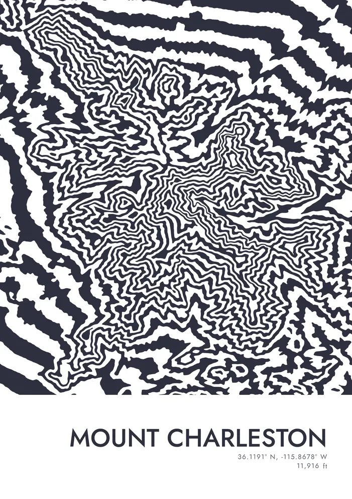 A classic two-color contour map of Mount Charleston, the highest peak in southern Nevada, USA.