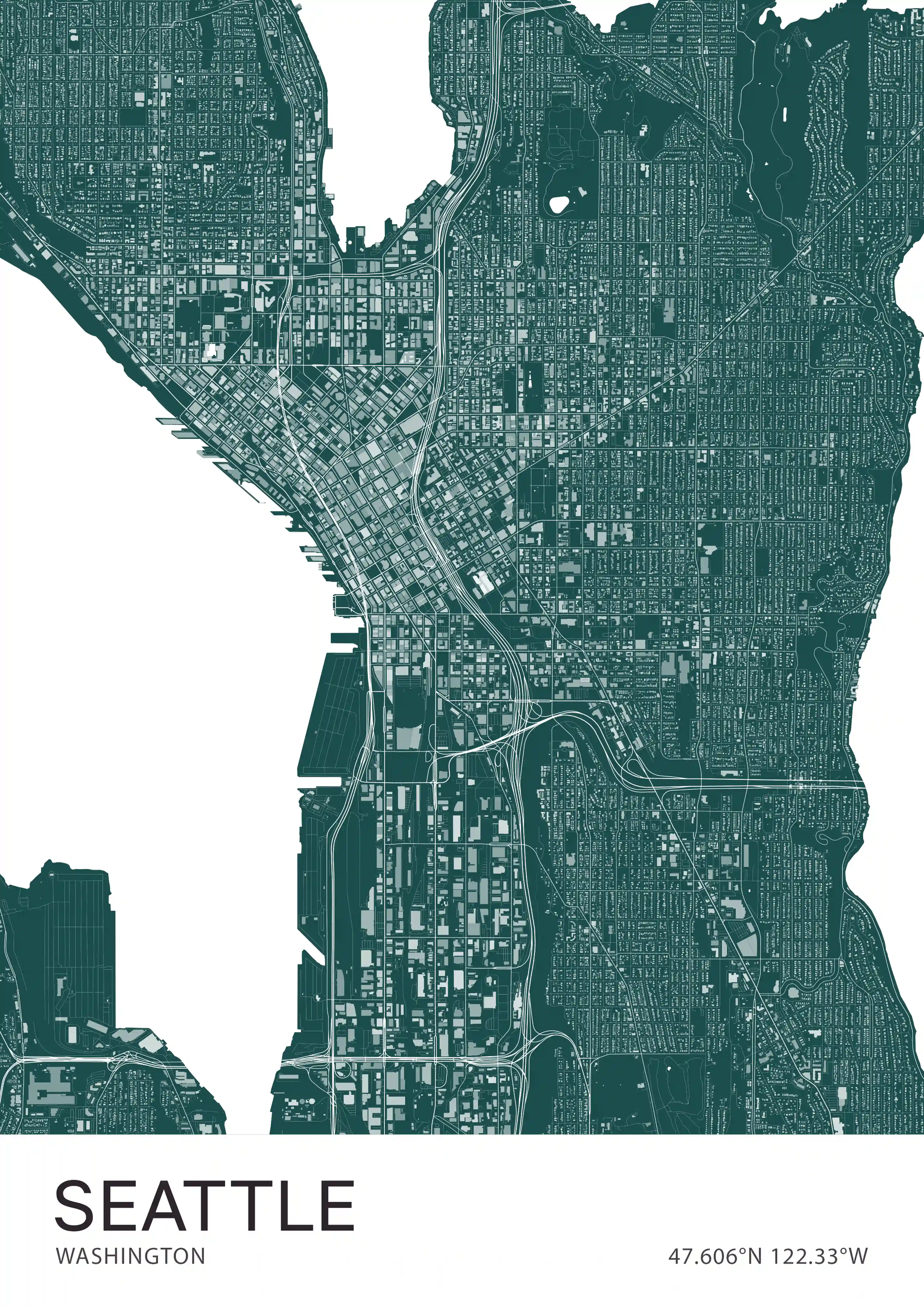 A detailed map of Seattle, USA’s dynamic city known for its scenic waterfront, thriving tech scene, and vibrant coffee culture.